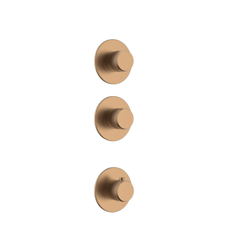 STRIA TRIM SET FOR SHOWER MIXER – 3-WAY WITH 3 STOP VALVES – THERMOSTATIC – BUILT-IN – ROUND – REFINED RIBBED HANDLES – BROWN BRONZE (PVD)