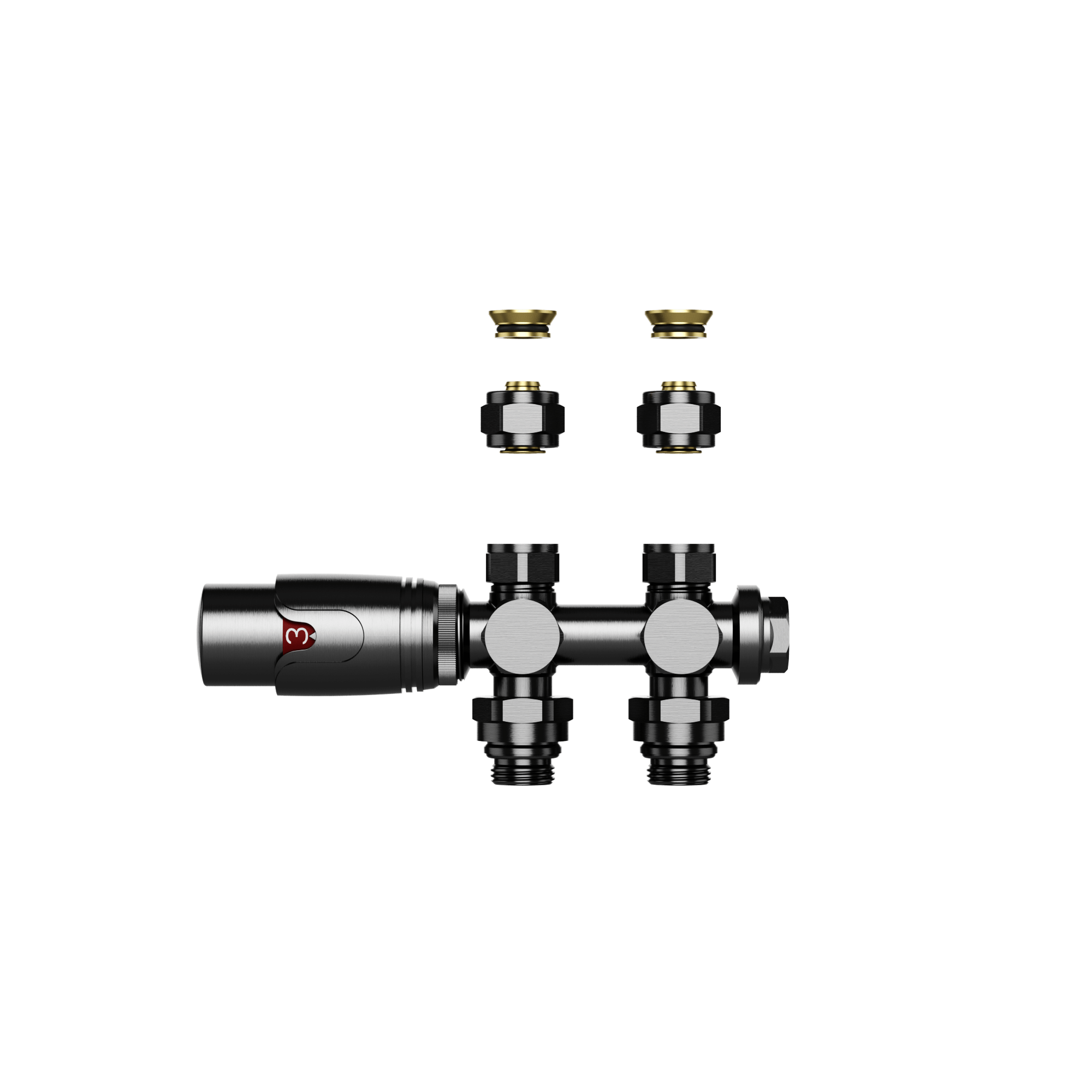 VANNE DE RADIATEUR – DESIGN – THERMOSTATIQUE – RACCORDEMENT MUR ET SOL – 1/2″ mâleX16/2 M30 – NOIR MAT