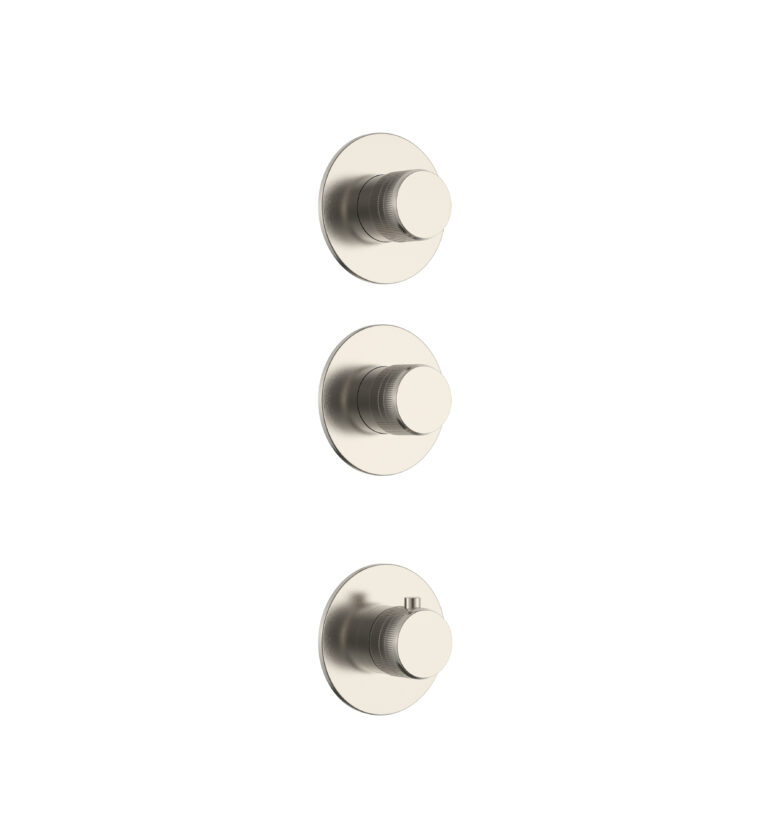 STRIA TRIM SET FOR SHOWER MIXER – 3-WAY WITH 3 STOP VALVES – THERMOSTATIC – BUILT-IN – ROUND – REFINED RIBBED HANDLES – BRUSHED Acier inoxydable
