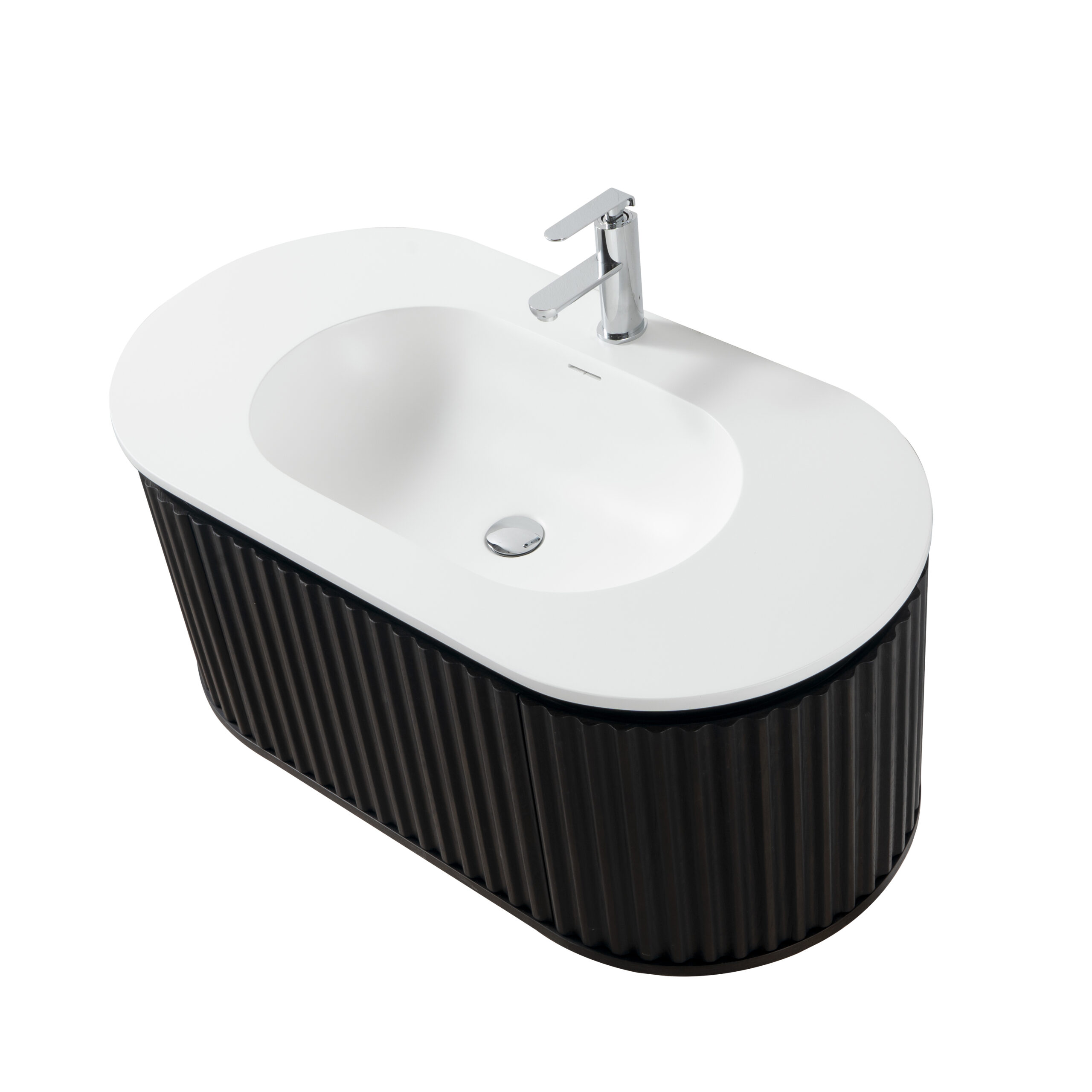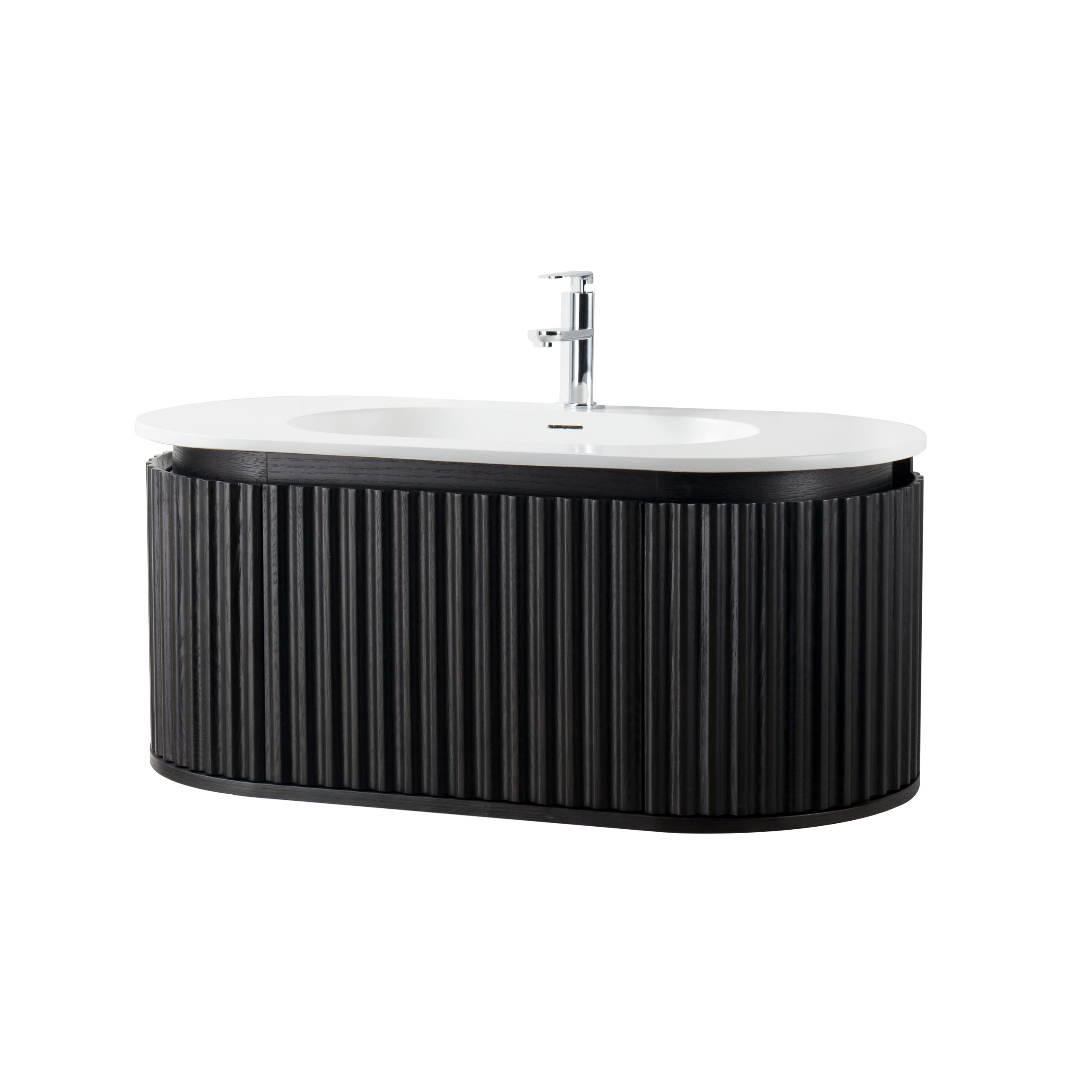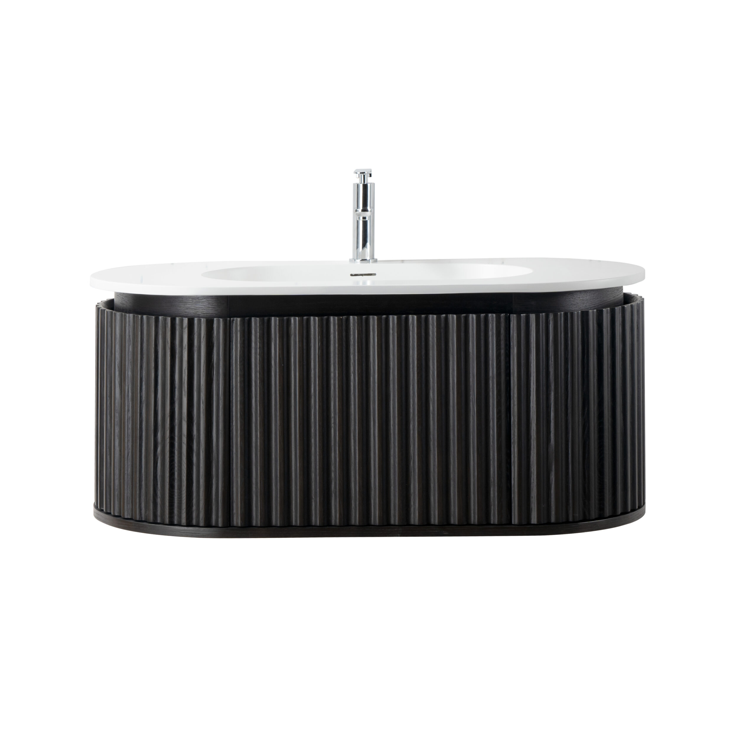 Enhance your bathroom with this stunning Begonia washbasin cabinet in black oak, a masterpiece of design and functionality. With its distinctive design, wide vertical lines, and elegant rounded shape, this cabinet exudes timeless elegance that fits perfectly in both modern and classic bathrooms.