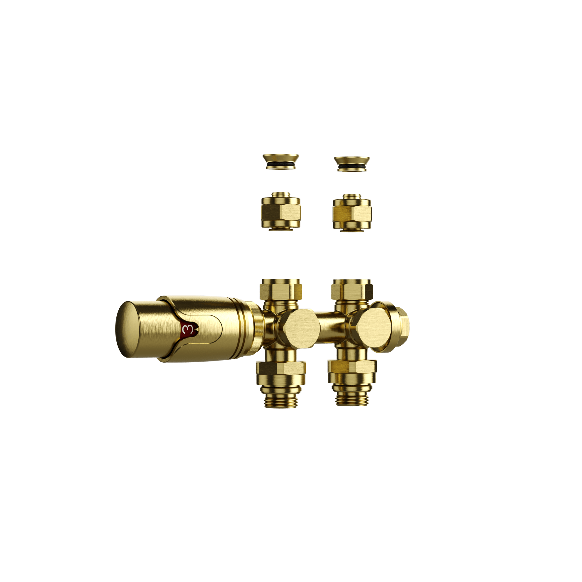 VANNE DE RADIATEUR – DESIGN – THERMOSTATIQUE – RACCORDEMENT MUR ET SOL – 1/2″ mâleX16/2 M30 – OR BROSSÉ