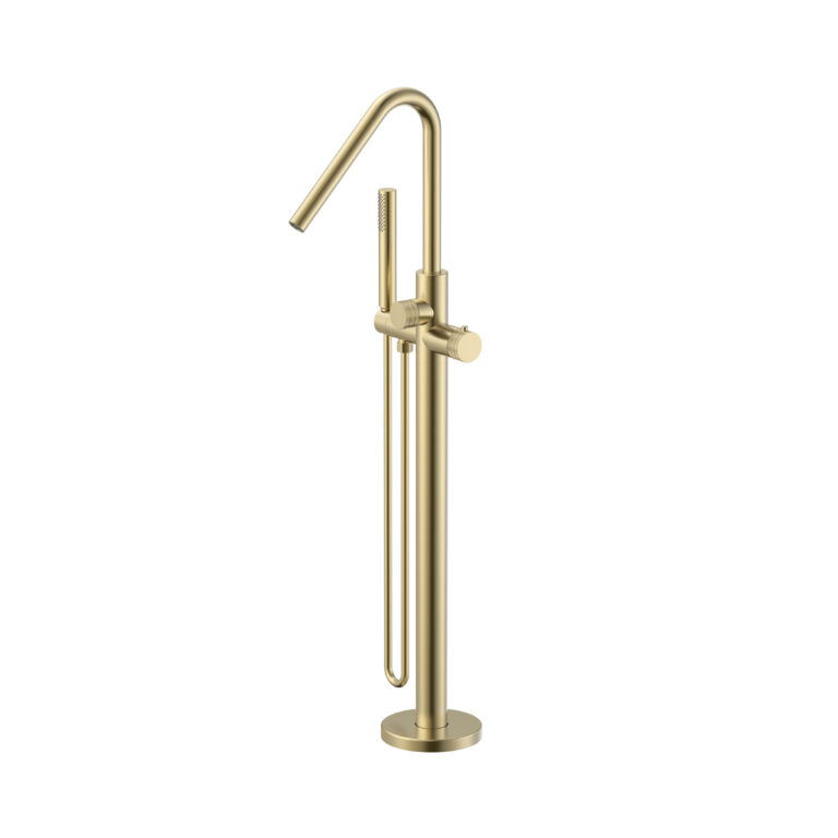 STRIA BATH MIXER – FREESTANDING – THERMOSTATIC – WITH HAND SHOWER AND HOSE – REFINED RIBBED HANDLES – BRUSHED GOLD (PVD)