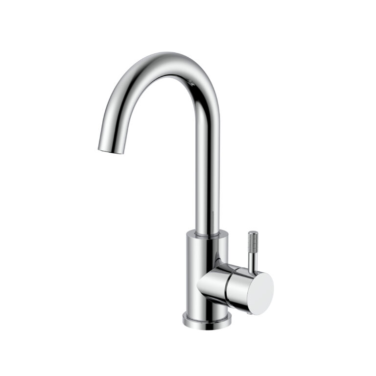 STRIA BASIN MIXER – CURVED SWIVEL SPOUT – COLD START – REFINED RIBBED HANDLE – WITHOUT WASTE – CHROME